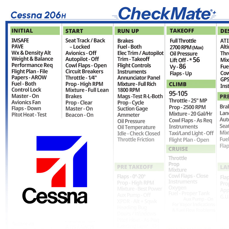 5”x7” plastic card featuring an "abbreviated" checklist for pilots who prefer minimalism. It highlights only the most critical information while retaining all V-speeds and emergency procedures from CheckMate.