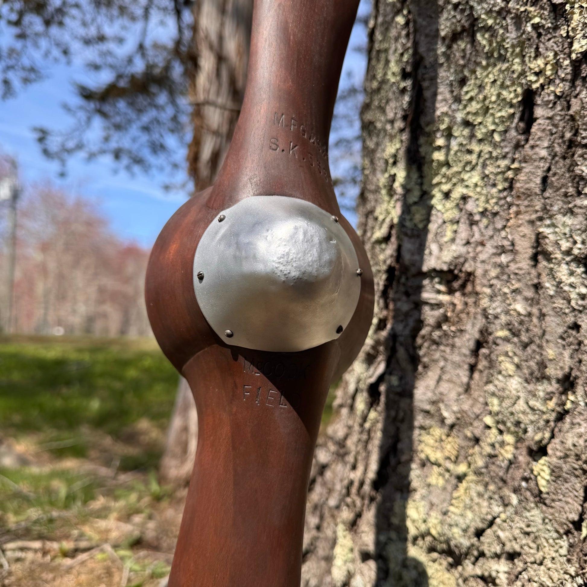 Marked with MFG No. 03258 and S.K. 5530, this piece was likely used in wind tunnel testing or high-RPM structural experiments. The removable, hand-formed aluminum spinner cone exhibits wear consistent with heavy use, while the blades show signs of period repairs — all reinforcing its role in McCook’s hands-on R&D process.